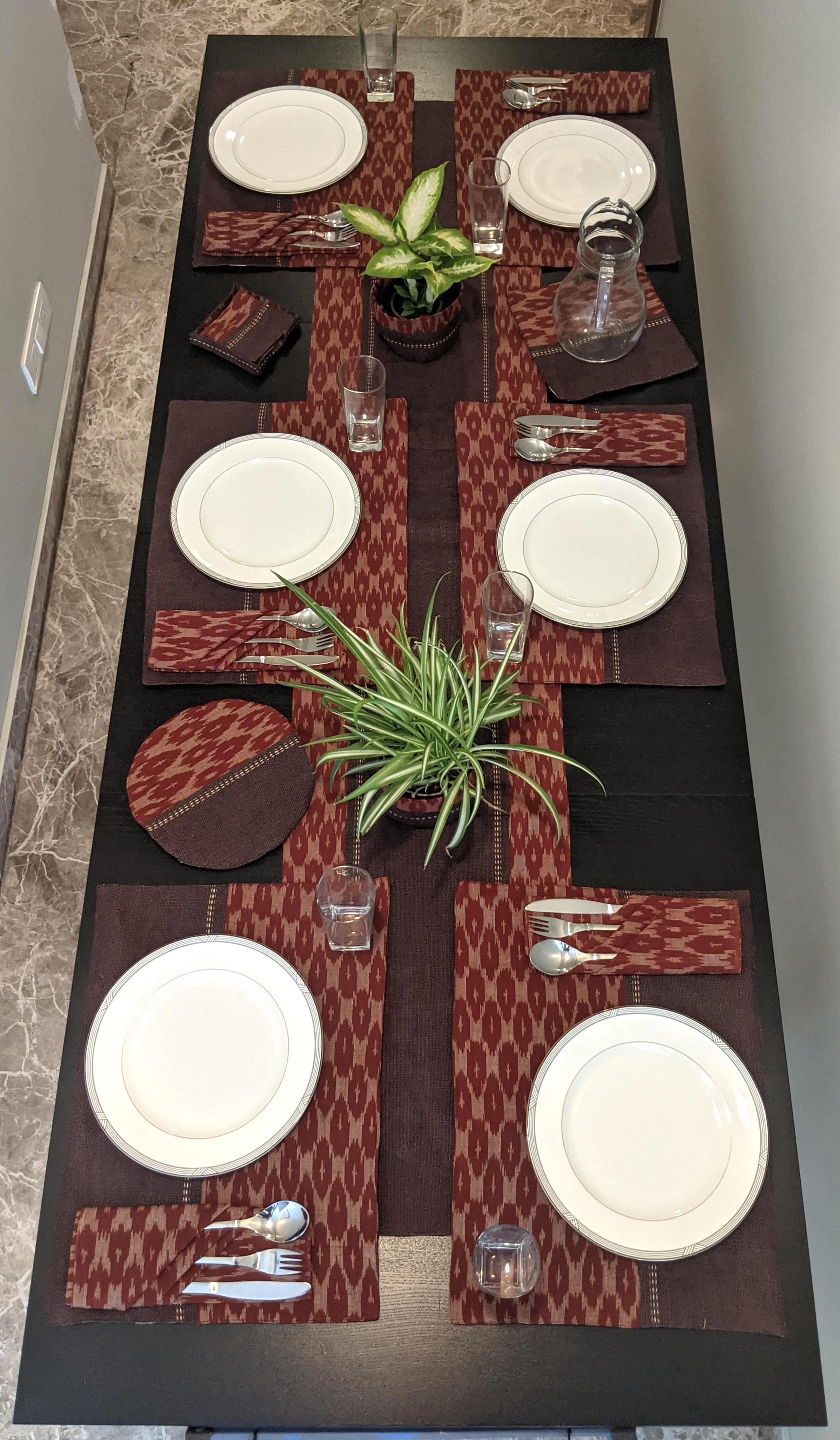 A made-to-order set of 6 placemats, 6 contrasting napkins or 6 coasters and 1 matching runner, they will evoke appreciation from your diners for their uniqueness at your table.