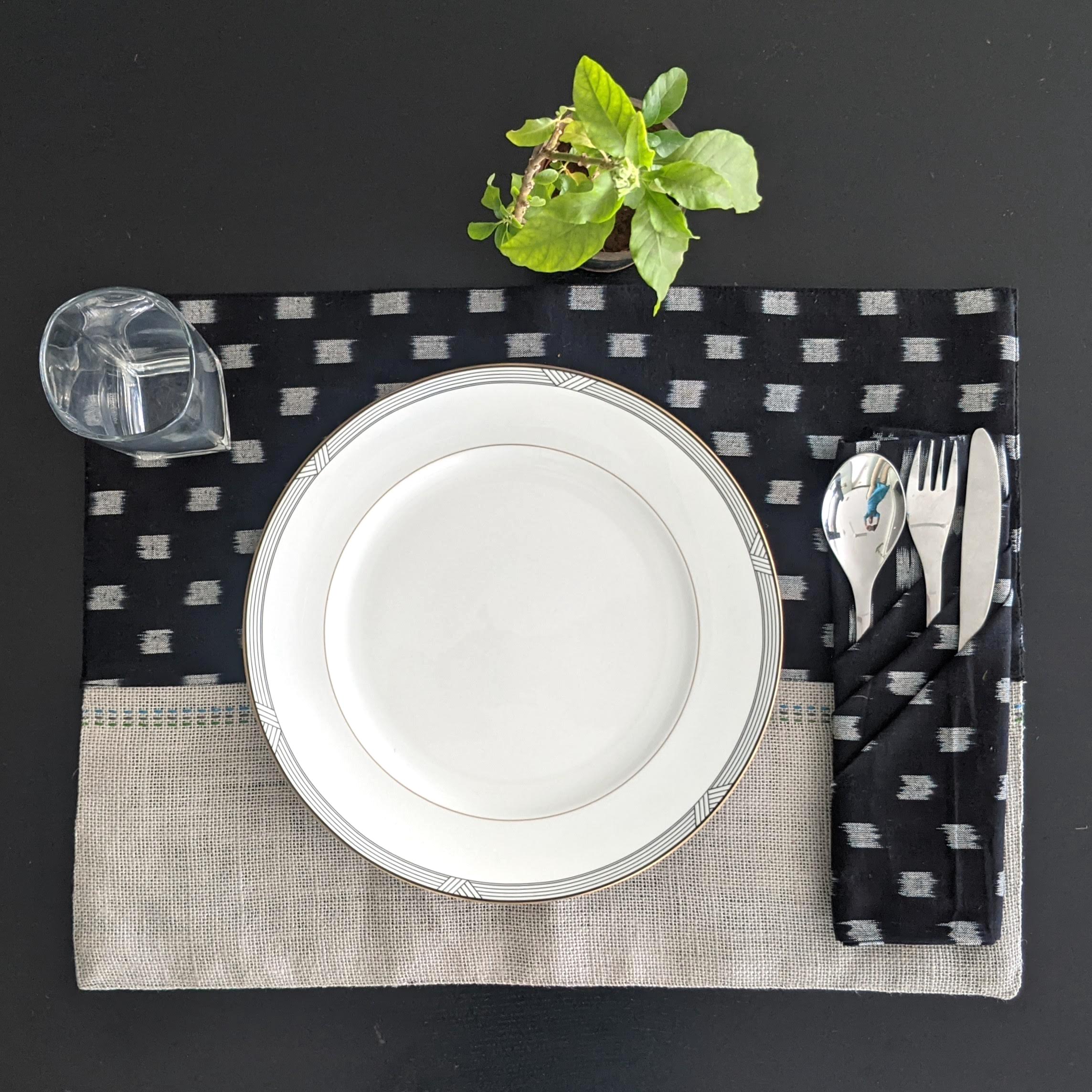 Select from among our unique designs and combinations that cover a breadth of warm, neutral, and cool colors. Understated yet elegant kantha embroidery runs through all placemats and the runner. The embroidery colors are artistically and interestingly combined to highlight yet add that refined touch to the jute mat as well as the contrasting napkins.