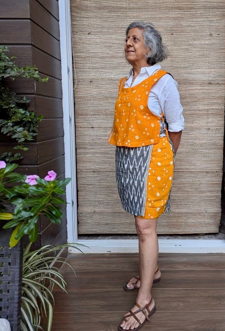 - Discover the charm of Ohrna’s handwoven cotton wrap around skirt. Designed for comfort and versatility, the wrap around skirt boasts two complementary colors, paired together to create a harmonious blend of elegance and playfulness. The brighter color gracefully peeks through as a small, tasteful slit, adding a touch of allure to every step. Finished with a vertical jute trim and our signature kantha embroidery along the height of the skirt, it effortlessly blends traditional craftsmanship with contemporary style.